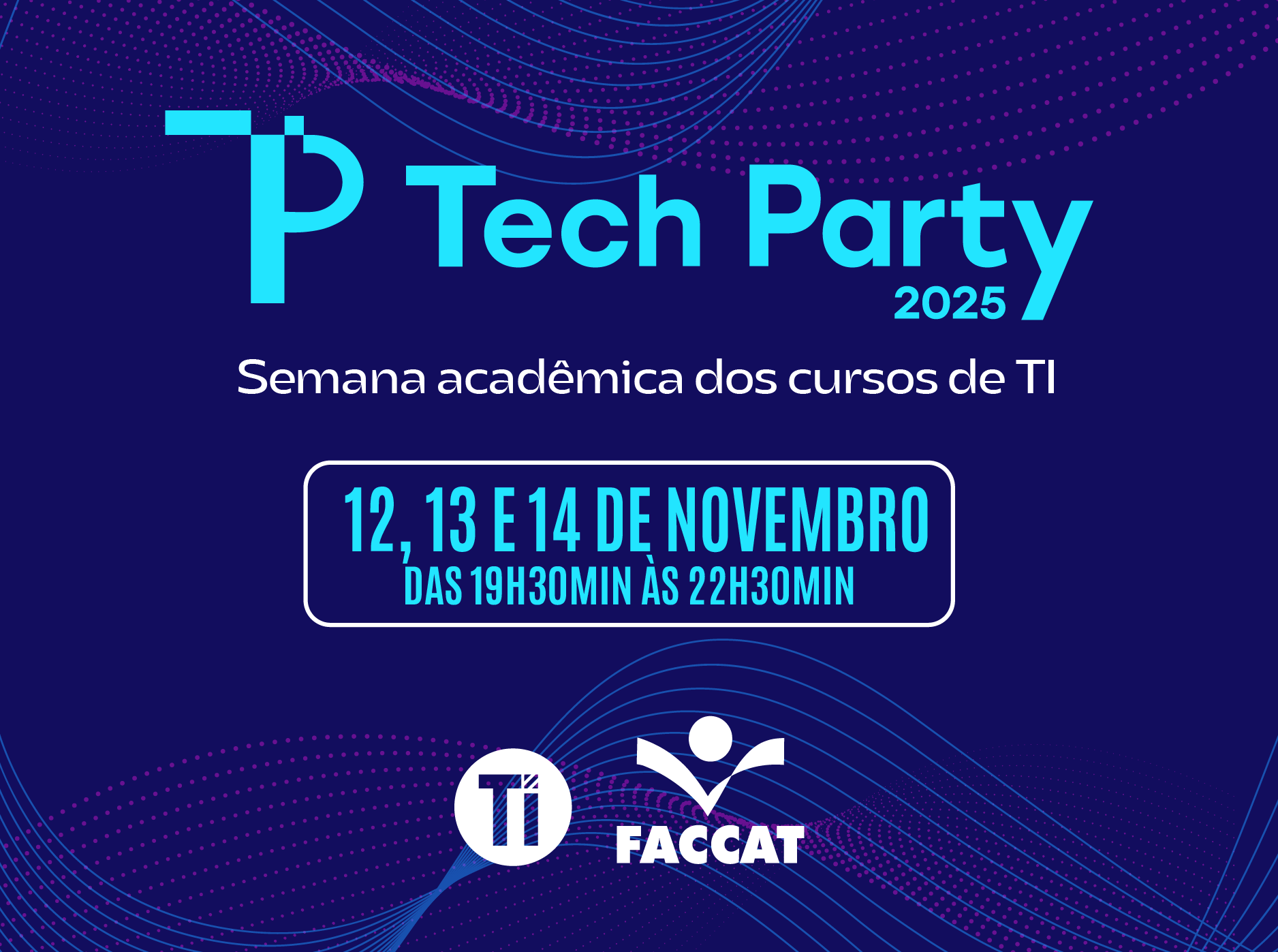 Nos dias 12, 13 e 14 de novembro, acontece a Tech Party 2025, evento gratuito promovido pelos cursos de Sistemas de Informação, Sistemas para Internet e Jogos Digitais das Faculdades Integradas de Taquara (Faccat). Voltado a acadêmicos, profissionais e para quem gosta da tecnologia, o encontro será realizado no Auditório 3 do Centro de Eventos da Faccat, sempre às 19h30min. As inscrições estão abertas e devem ser feitas por meio de formulário eletrônico em www.faccat.br/cursoseeventos.