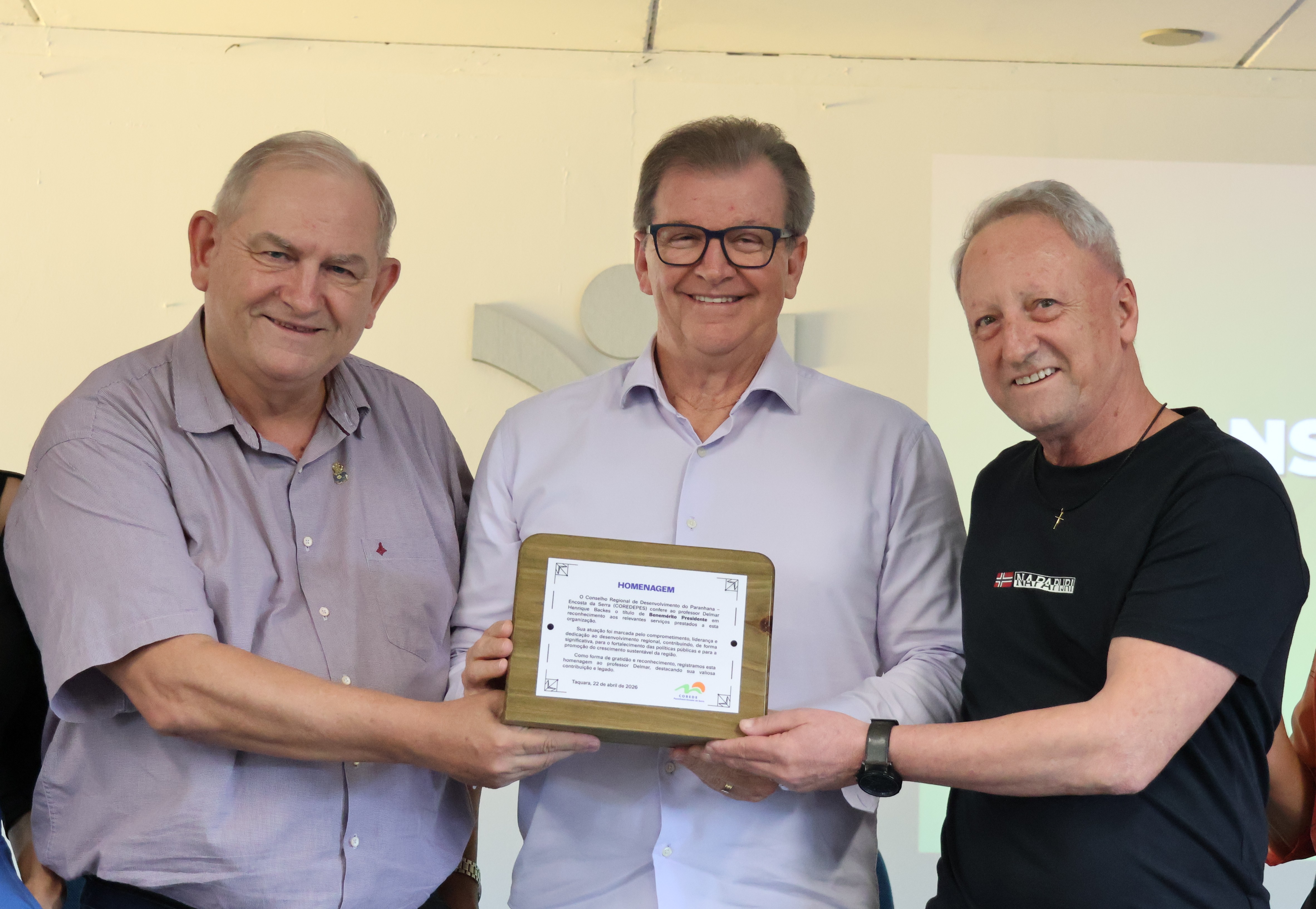 A Assembleia Pública Inicial da Consulta Popular 2026/2027, realizada na tarde de 22 de abril, em Taquara, foi marcada por um momento muito especial. O diretor-geral das Faculdades Integradas de Taquara (Faccat), Delmar Backes, foi homenageado. Ele, que este ano recebeu o título de presidente benemérito do Conselho, recebeu na tarde de ontem uma placa em homenagem à sua atuação desde a criação do colegiado e à contribuição ao desenvolvimento da região.