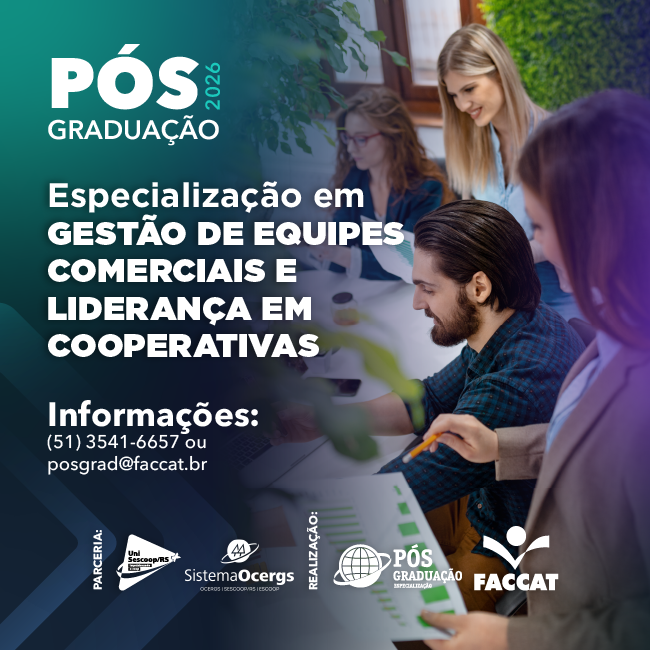 Formar gestores e líderes para cooperativas capazes de integrar competências avançadas em gestão comercial, liderança cooperativista e visão estratégica de longo prazo. O curso busca desenvolver profissionais aptos a atuar de maneira consultiva, orientada a resultados e fundamentada nos princípios do cooperativismo, promovendo práticas de gestão humanizadas, sustentáveis e inovadoras. Pretende-se fortalecer a capacidade de liderar equipes comerciais de forma colaborativa, estimular a tomada de decisões baseada em dados, ampliar a competitividade das cooperativas e fomentar ambientes organizacionais que valorizem a cultura cooperativista, o desenvolvimento de pessoas e a geração de impacto positivo nas comunidades atendidas.